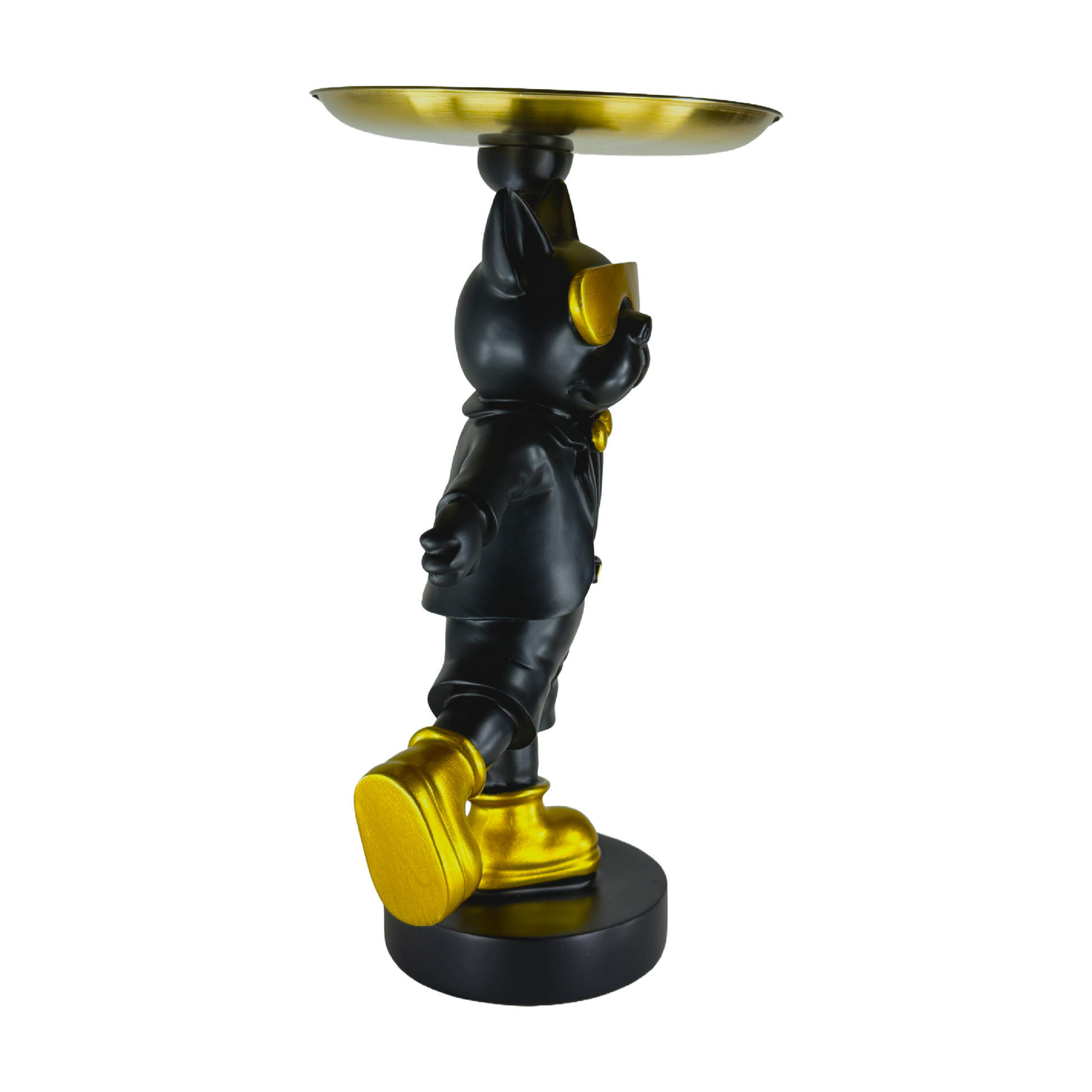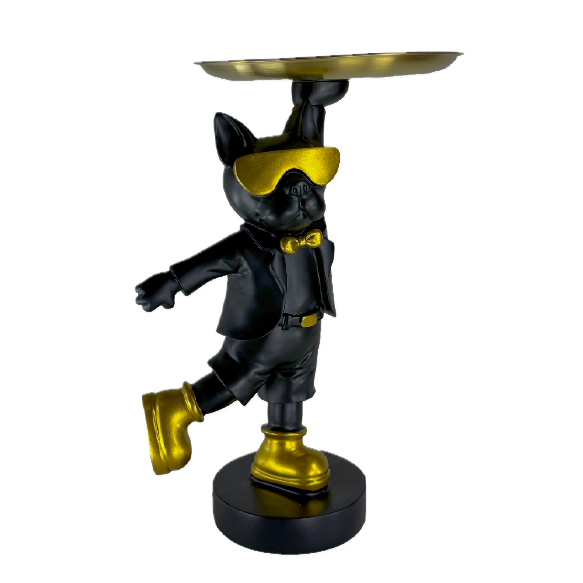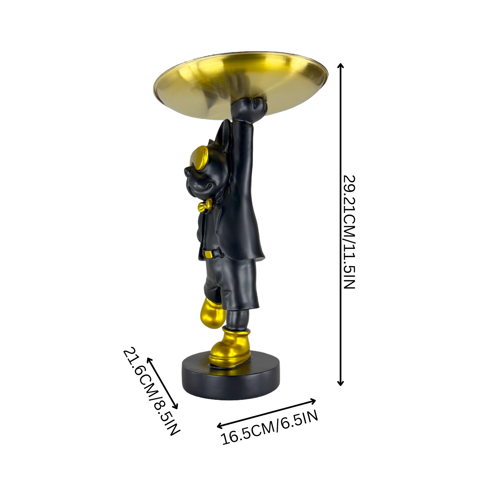 Crafted in deep matte black with radiant gold accents, The Dapper Pup isn’t just an accessory — it’s an experience. The elevated tray adds practical function for serving or display, while the playful pose turns it into a conversation piece that instantly draws attention.