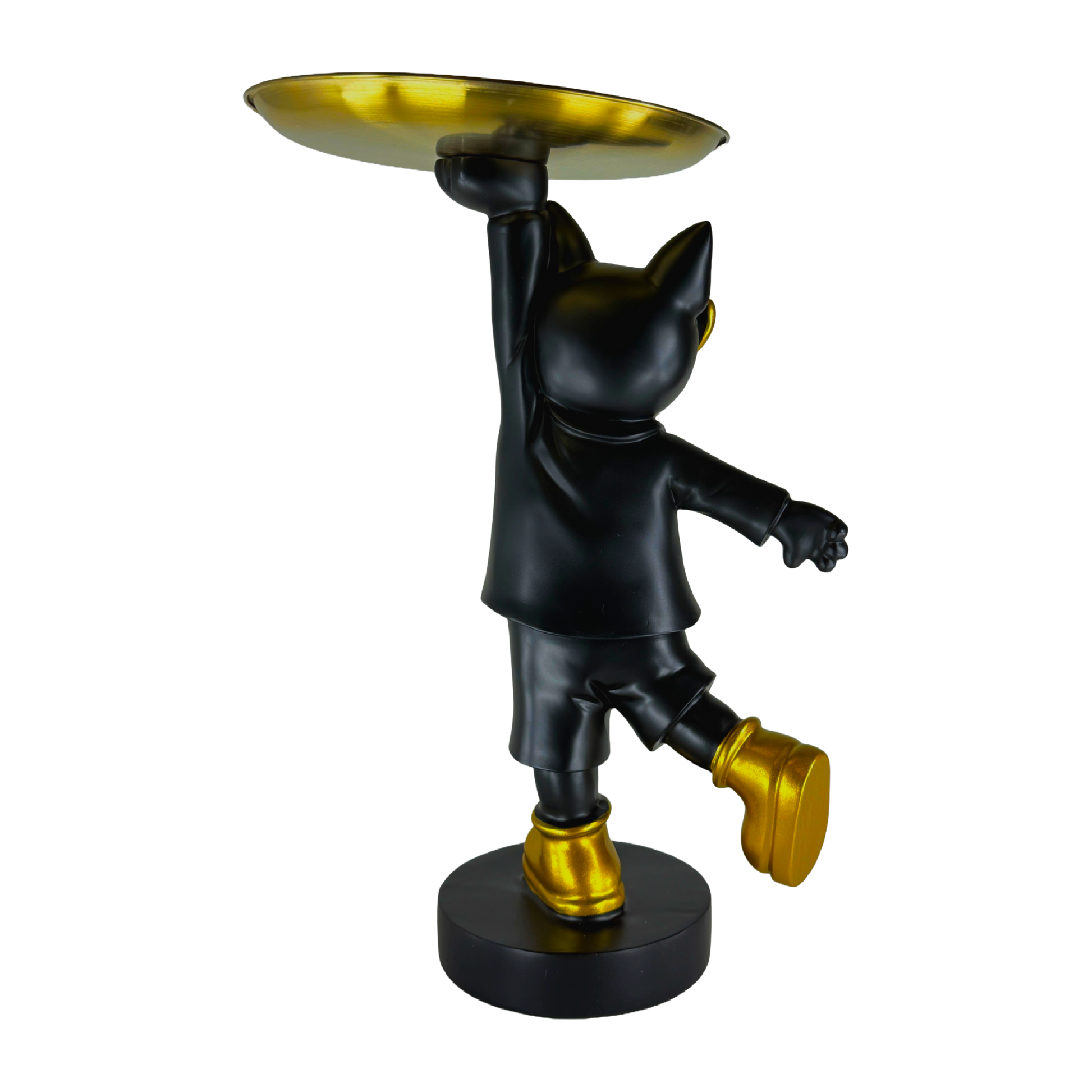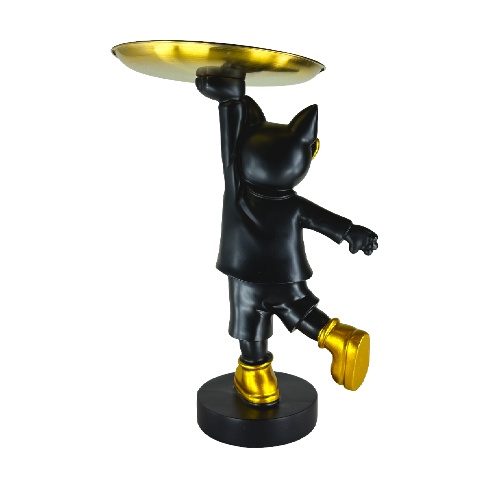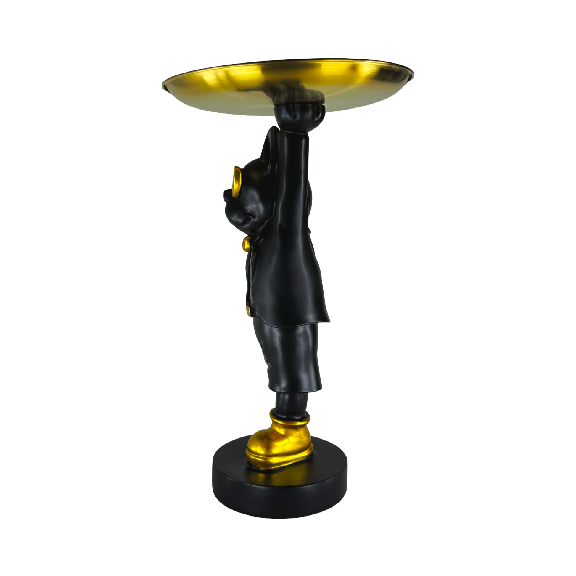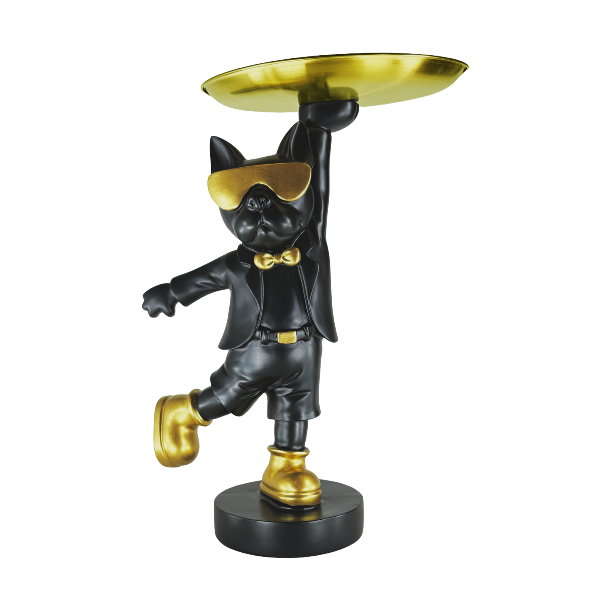 Crafted in deep matte black with radiant gold accents, The Dapper Pup isn’t just an accessory — it’s an experience. The elevated tray adds practical function for serving or display, while the playful pose turns it into a conversation piece that instantly draws attention.